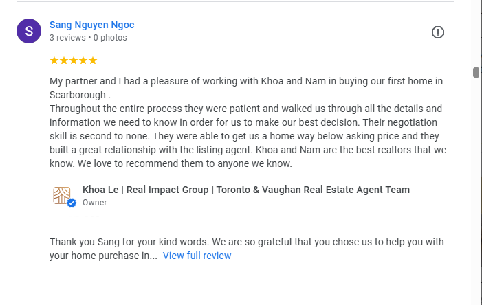 In the highly competitive Toronto real estate market, securing the perfect home—especially as a first-time homebuyer—can often feel like an overwhelming challenge. However, for clients Sang and their partner, their experience was seamless and highly successful, thanks to the expertise of Khoa Le and Nam from The Real Impact Group. Khoa Le is incredibly grateful and proud to share the recent 5-star Google review received from Sang, a testament to the team’s dedication and skill in delivering exceptional results.