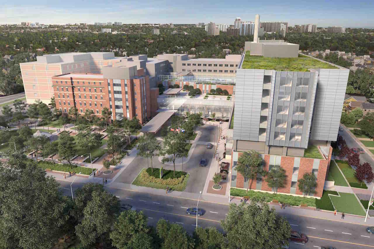 Looking east to the Michael Garron Hospital Renewal, designed by Diamond Schmitt Architects, B+H Architects, and Cannon Design for Infrastructure Ontario