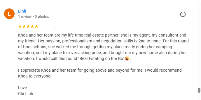 "Khoa and her team are my life time real estate partner. she is my agent, my consultant and my friend. Her passion, professionalism and negotiation skills is 2nd to none... she walked me through getting my place ready during her camping vacation, sold my place for over asking price, and bought me my new home also during her vacation. I would call this round 'Real Estating on the Go'😉."
